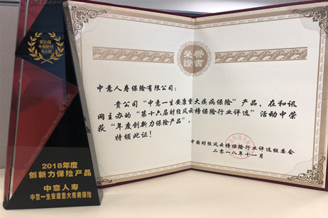 中意人壽“中意一生安康重大疾病保險產(chǎn)品”在和訊網(wǎng)主辦的“第十六屆財經(jīng)風(fēng)云榜保險行業(yè)評選”活動中獲得“年度創(chuàng)新力產(chǎn)品“的榮譽。