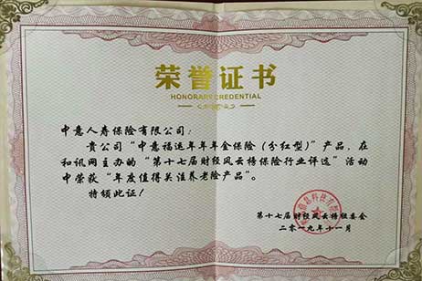中意福運年年年金保險(分紅型)獲“年度值得關(guān)注養(yǎng)老險產(chǎn)品”--證書